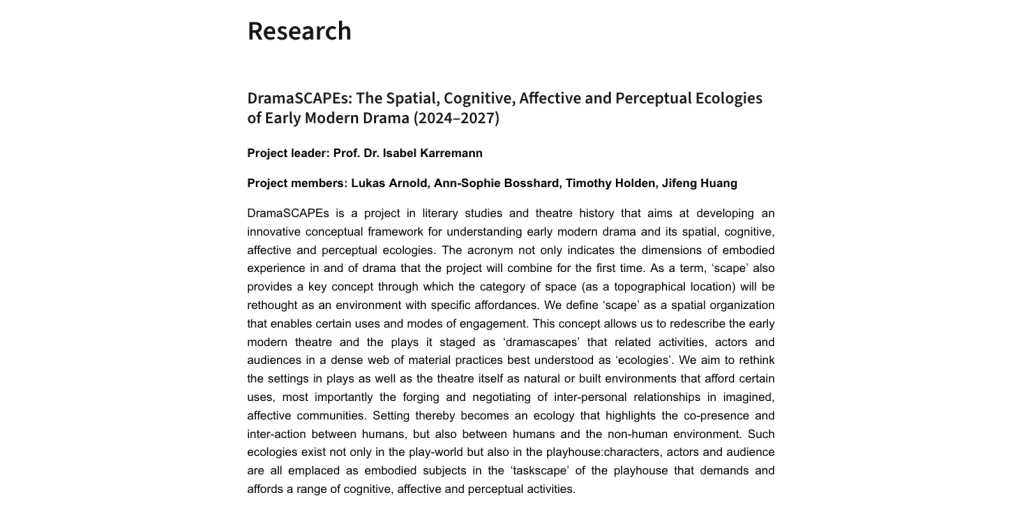 « DramaSCAPEs: The spatial, cognitive, affective and perceptual ecologies of early modern drama » (2024-2028) at the University of Zurich directed by Isabel Karremann.