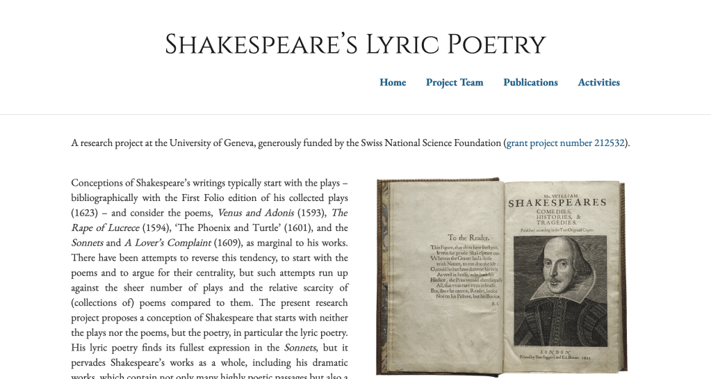 « Shakespeare’s Lyric Poetry » (2023-2027) at the University of Geneva directed by Lukas Erne.