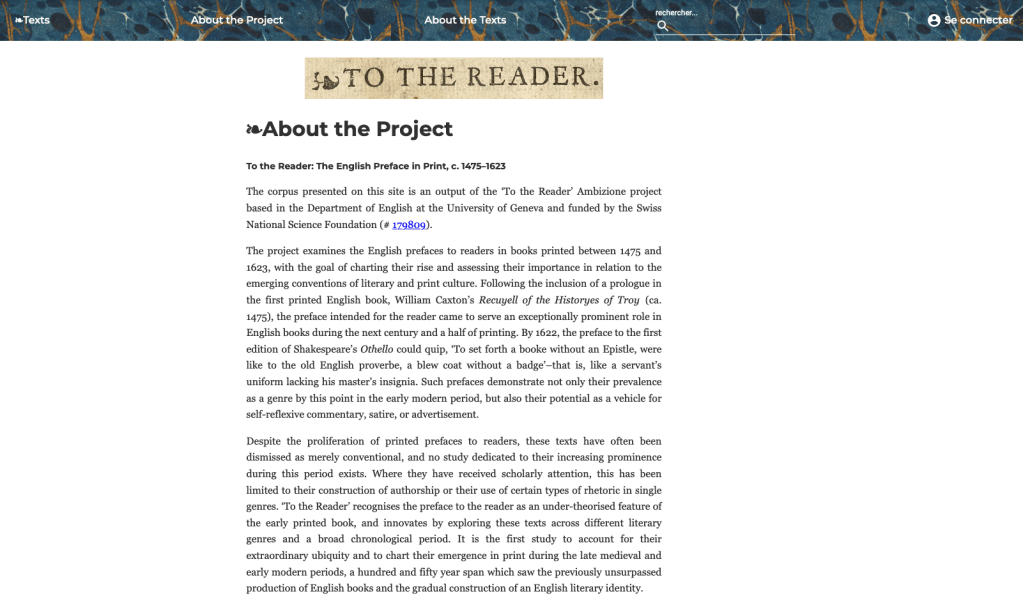 « To the Reader: The English Preface in Print, c. 1475-1623 » (2019-2024) at the University of Geneva directed by Devani Singh.